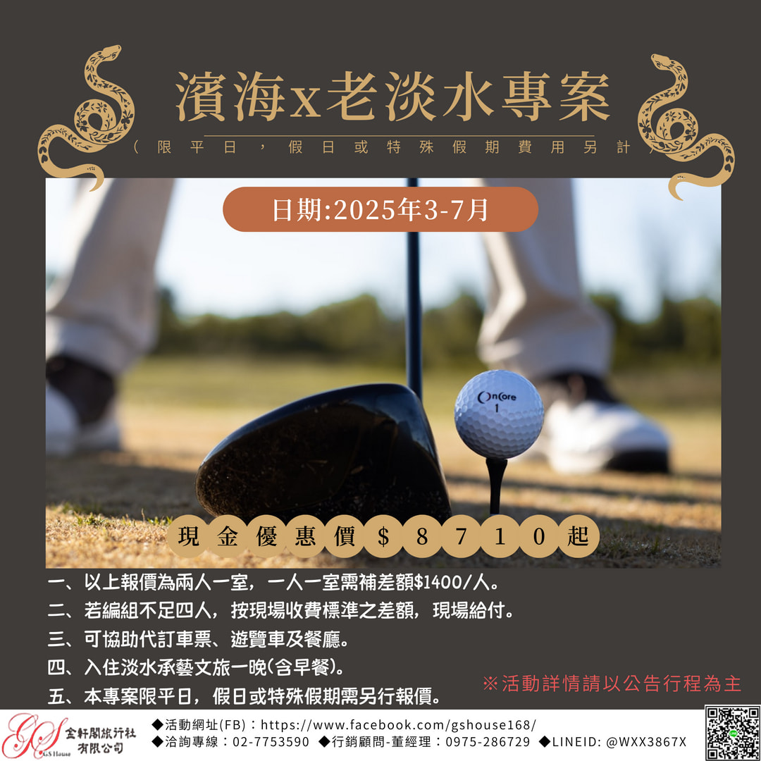 飯店內享用早餐後→前往老淡水球場進行第一場18洞擊球活動→午餐於球場內自理→結